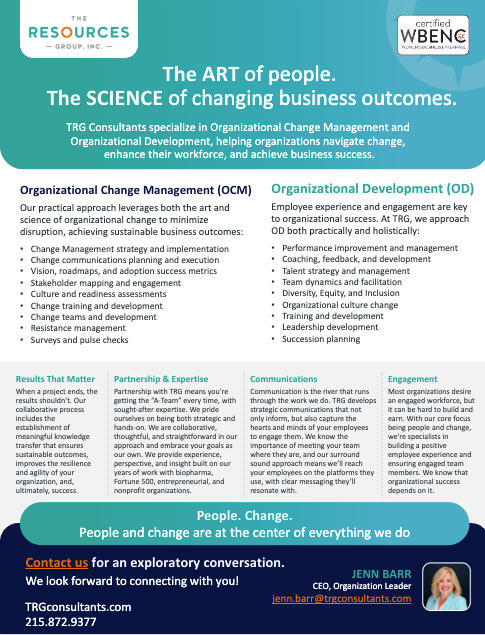 Jenn embodies everything we do at TRG. Whether it’s meaningful change and transformation work, organizational development, or HR consulting, she leads with empathy and compassion.Jenn’s work and life experiences have led to her vision of a workplace culture that fosters inclusive collaboration and champions teams and partners around her. Jenn’s approach is as transparent as it gets: She builds strong relationships through trust, direct and honest communication, and always strives to deliver results that exceed expectations.Jenn has more than 30 years of experience in business strategy, organizational change management, organizational & leadership development, human resources, communications, and training & development. Before founding TRG, Jenn was a Human Resources leader and worked in the pharmaceutical and healthcare advertising industries.Certifications: SHRM SCP, PROSCI, SAFeAgile, Lean Change